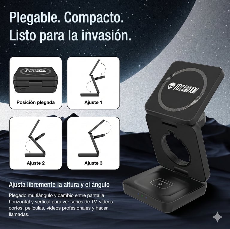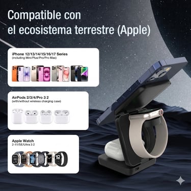 Elimina el caos de cables de tu escritorio, mesilla de noche o salón. Una sola estación elegante reemplaza tres cargadores. Tu espacio, por fin, respira — y tú también.