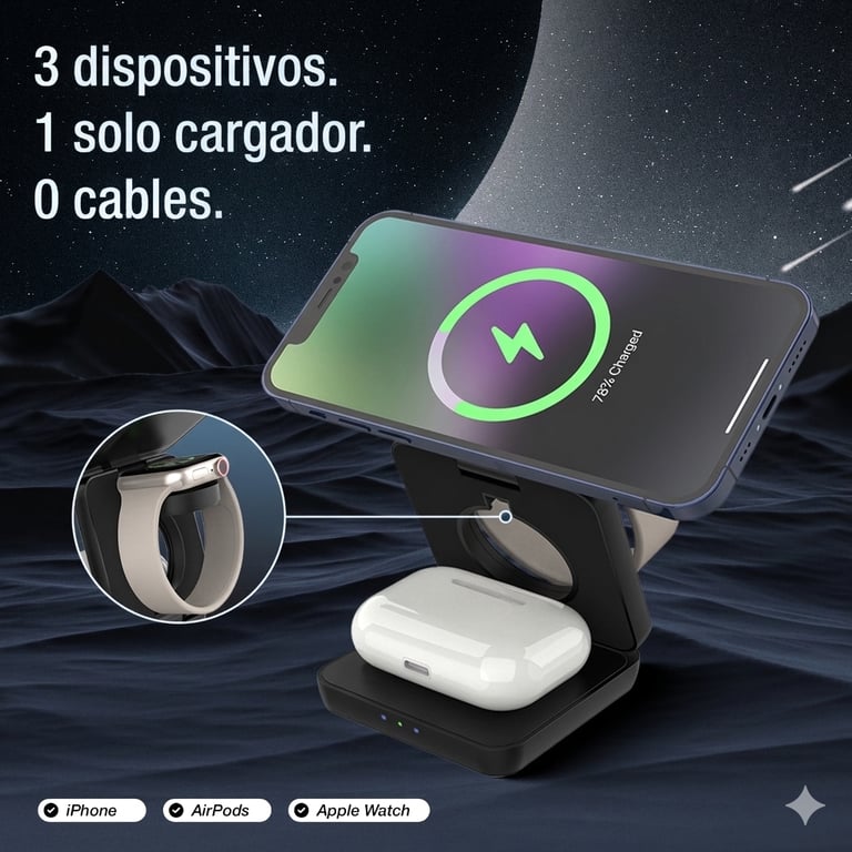 Carga tu iPhone, Apple Watch y AirPods al mismo tiempo. Sin cables, sin complicaciones, sin límites.