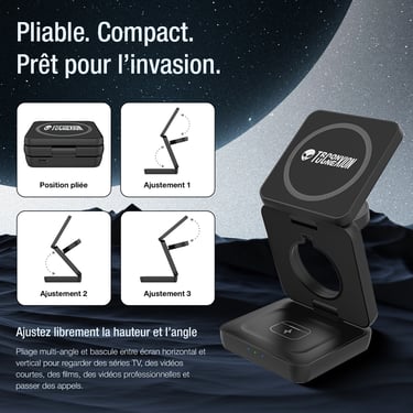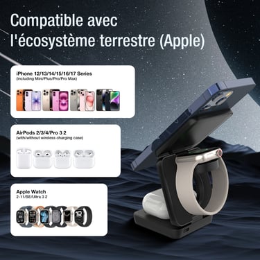 Rechargez votre iPhone, Apple Watch et AirPods simultanément avec notre station de charge rapide 15W ultra-compacte et pliable.