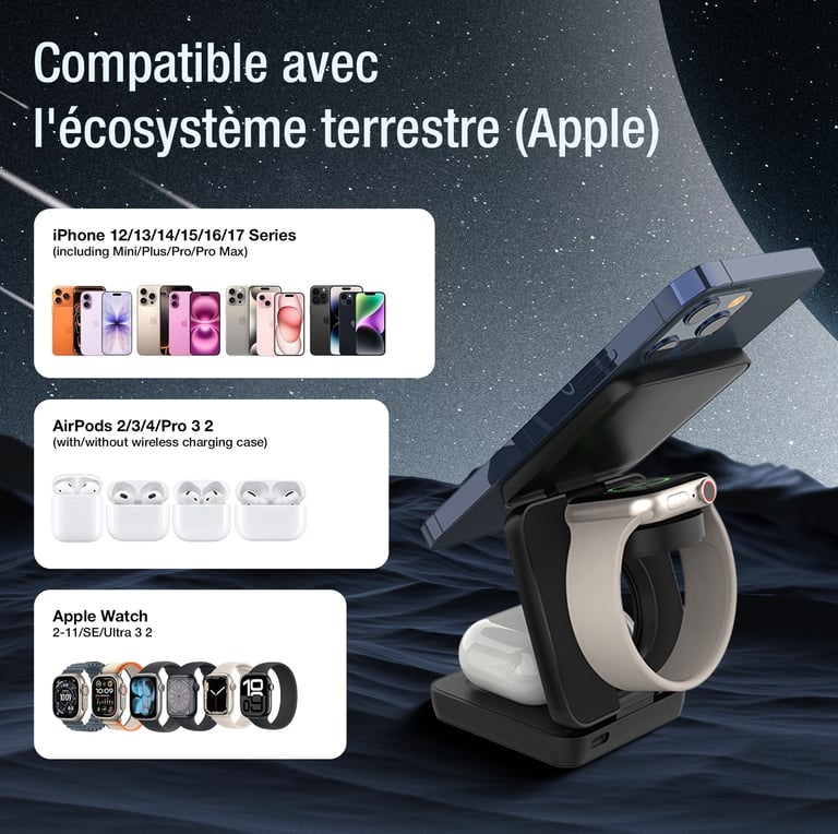 Rechargez votre iPhone, Apple Watch et AirPods simultanément avec notre station de charge rapide 15W ultra-compacte et pliable