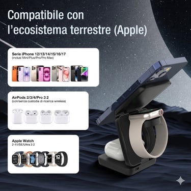 Compatto, pieghevole, ultraleggero. Un solo caricatore per tutti i tuoi dispositivi Apple. Più spazio in valigia, meno pensieri in partenza — più tempo per vivere il viaggio.