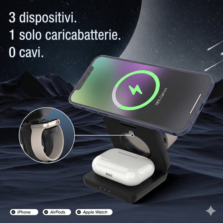 Ricarica smartphone, smartwatch e auricolari wireless allo stesso tempo. Addio groviglio di cavi sul comodino. La tua scrivania finalmente respira.
